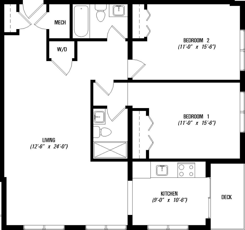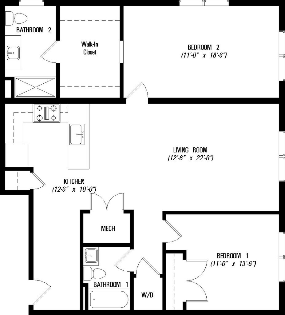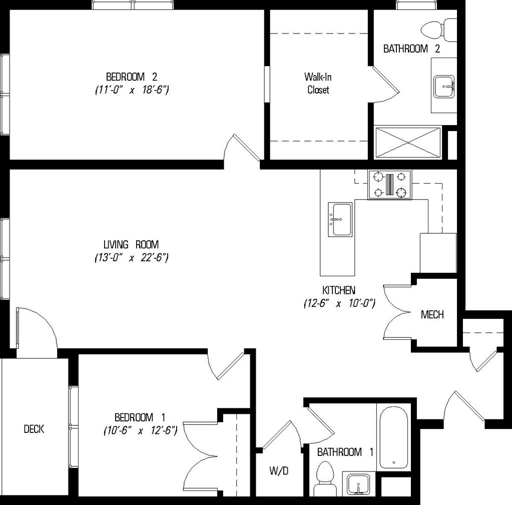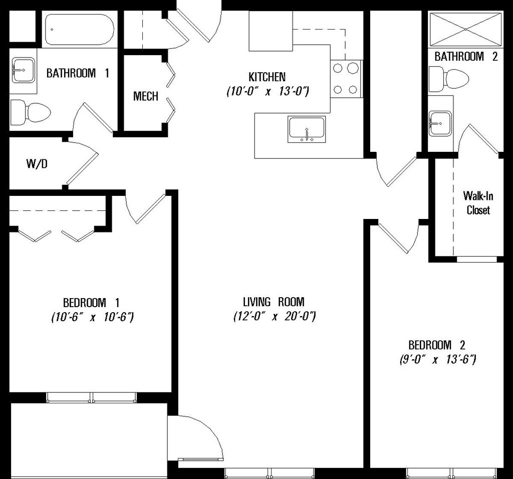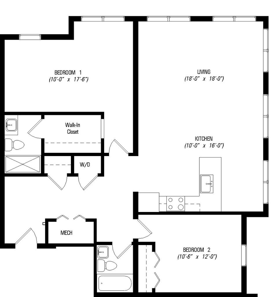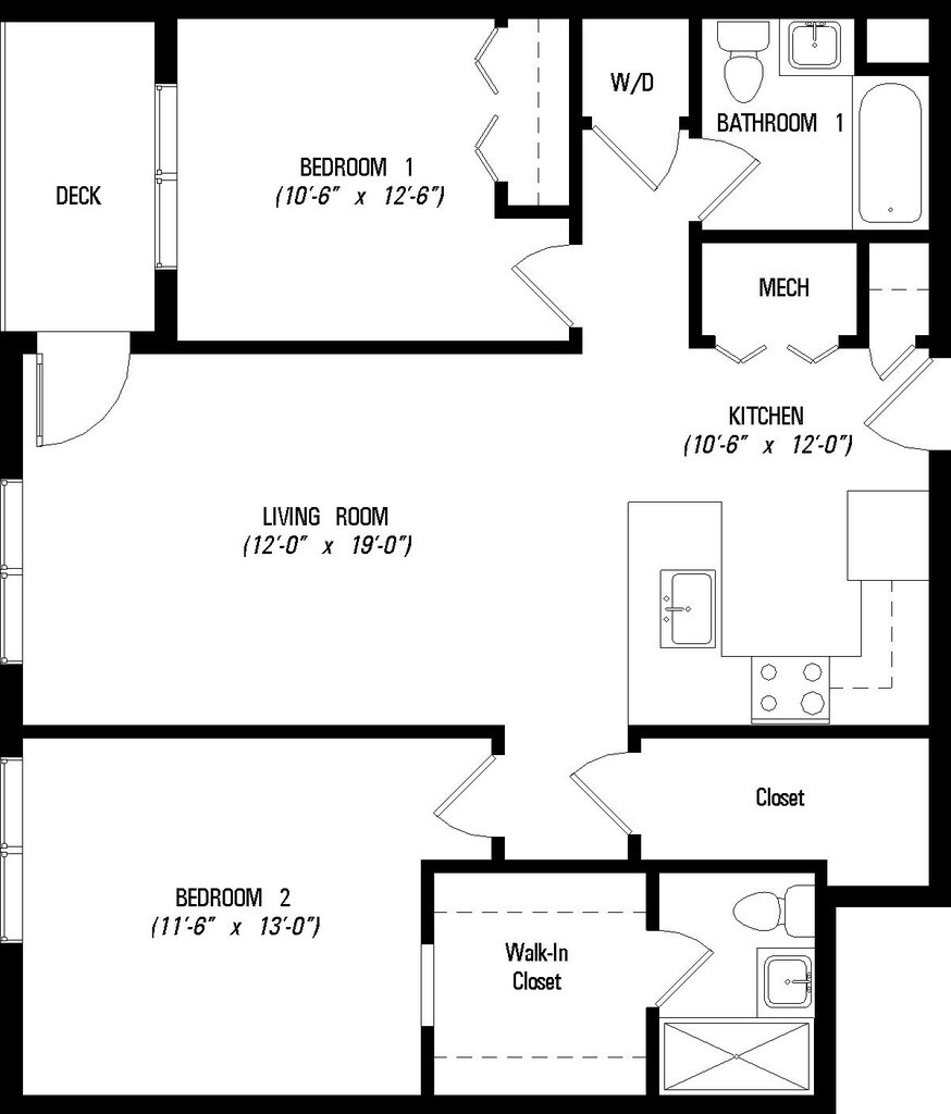 1 Bed, 1 bath - Floorplan 1 2 Bedrooms