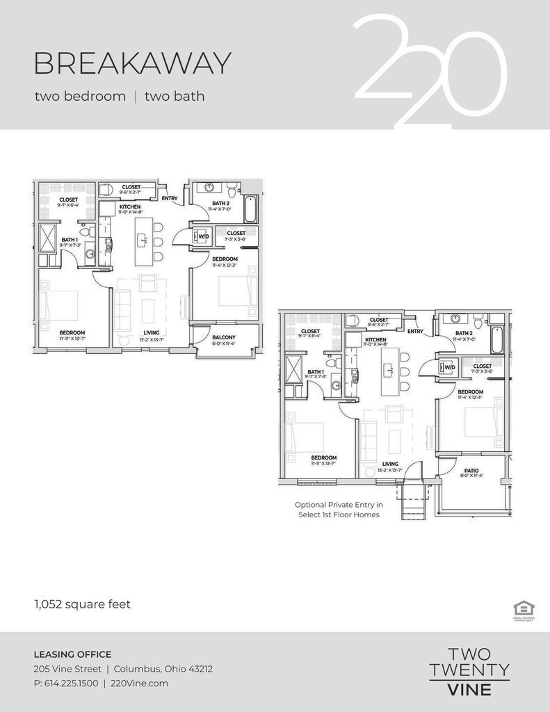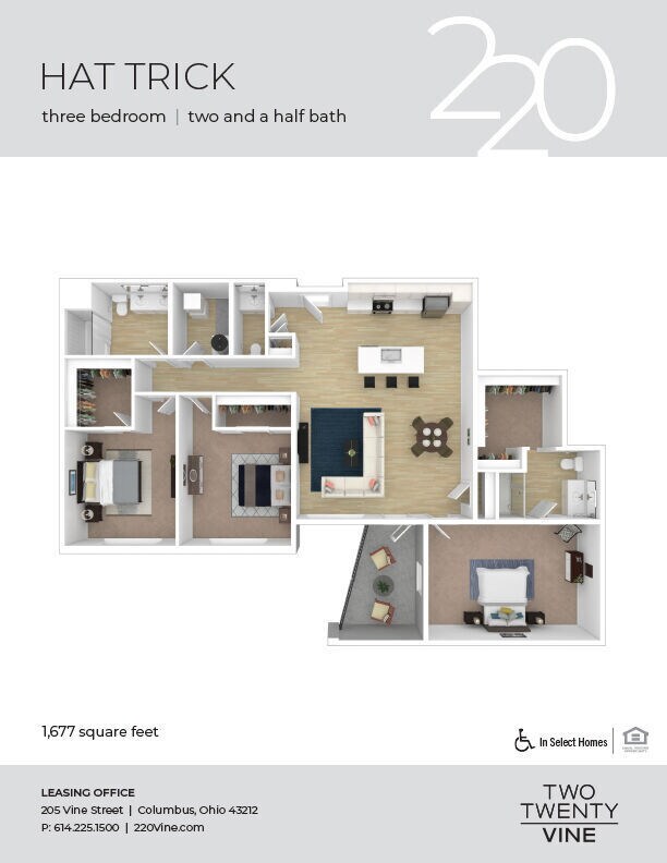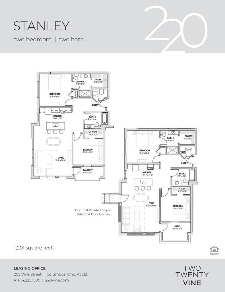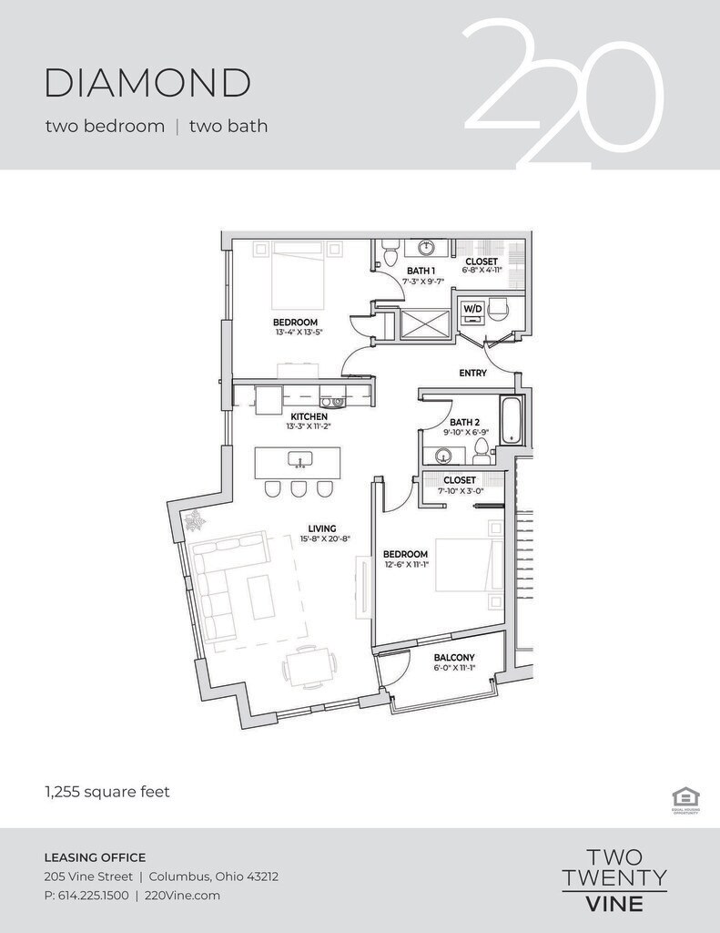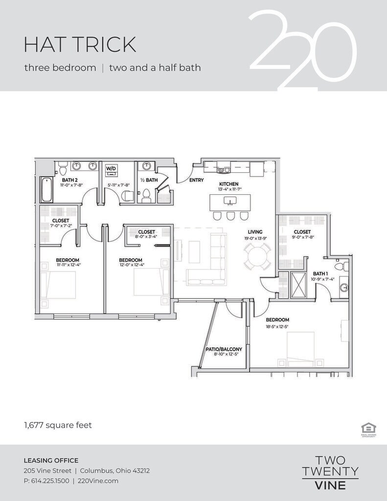 Two Twenty Vine offers 1 to 3 Bedroom apartments starting from $1,549 and having 737–1,677 sq ft. Here is the current pricing and availability: