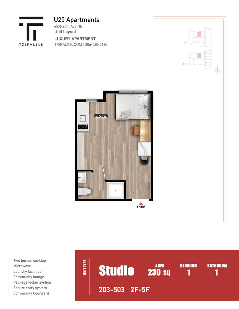 Welcome to U20 Apartments—Seattle’s premier student living in the heart of the vibrant University District! U20 offers a range of stylish, modern layouts, creating a comfortable home just a 5-minute walk from the UW campus. Each apartment includes a convenient kitchenette, perfect for students seeking both independence and community. The building offers a suite of amenities designed with student life in mind, including a secure package concierge service, an on-site laundry room, and a dedicated bike storage room for easy commuting. Located close to the University of Washington, public transit, and an array of local dining and shopping options, U20 Apartments brings the best of the city right to your doorstep. Discover your ideal home at U20 Apartments—where convenience, community, and modern living meet seamlessly.