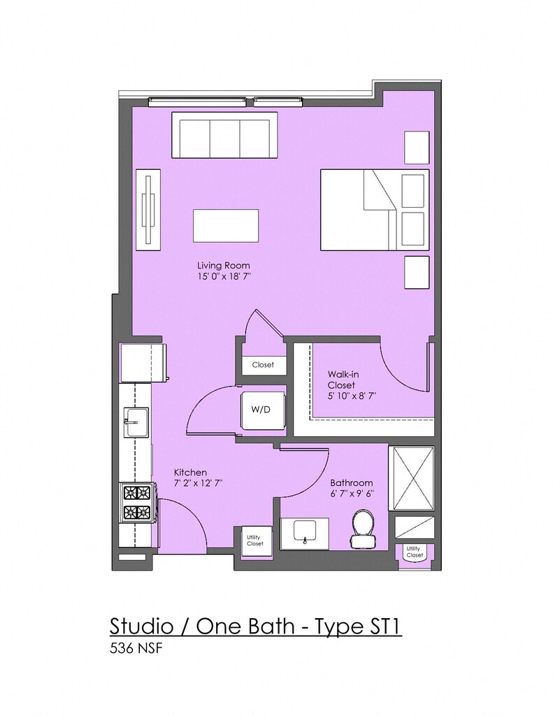 Studio, 1 Bath, 536-562 sq ftTotal Monthly PriceAvailable NowModel Gallery