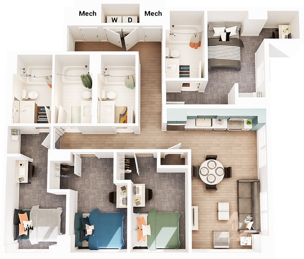 - Hardwood Inspired Floors and Carpeted Bedrooms