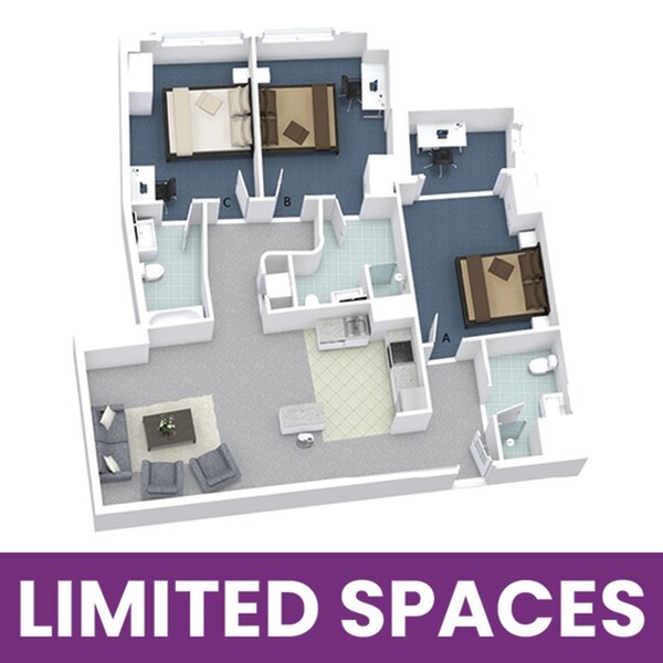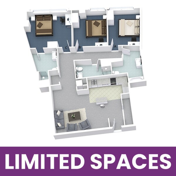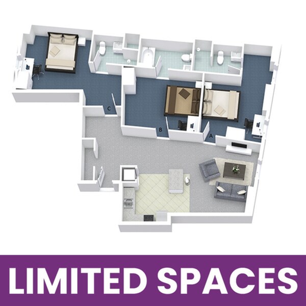 3x3D - Floorplan 2 Apartment Unit: PrivateApartment Model: 3x3D3 Bedroom, 3 Bath, sq ftAvailable August 15, 2026Apartment Unit: Private Premium FloorApartment Model: 3x3D3 Bedroom, 3 Bath, sq ftAvailable August 15, 20264 Bedrooms