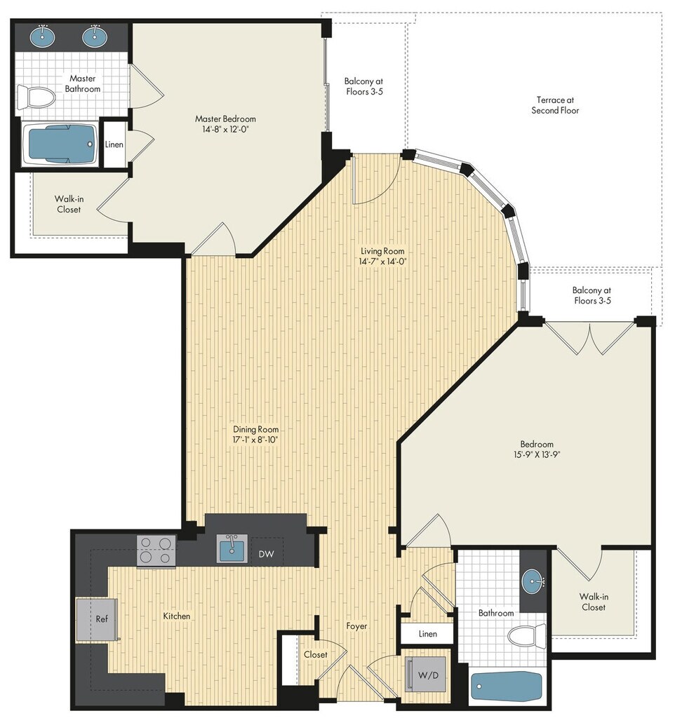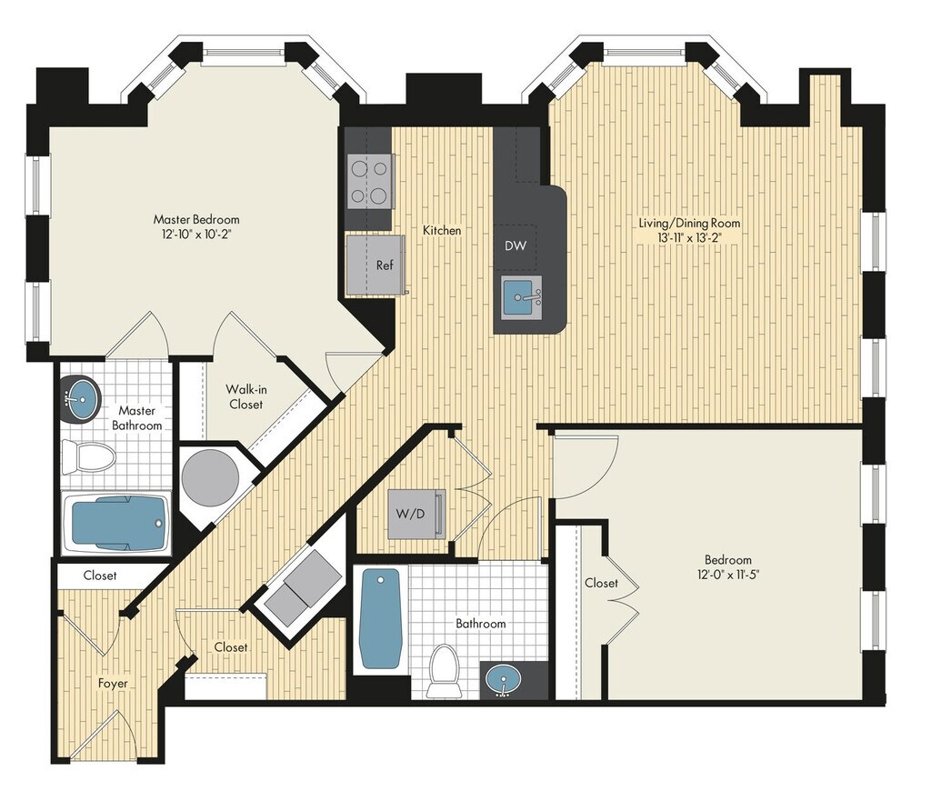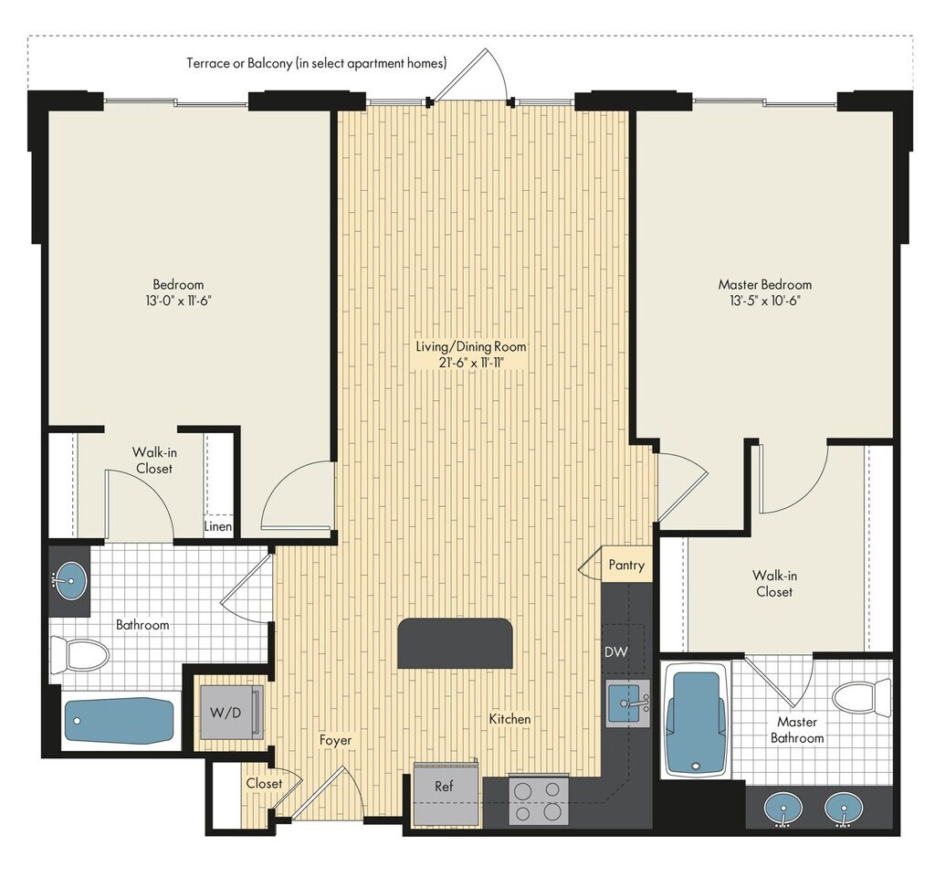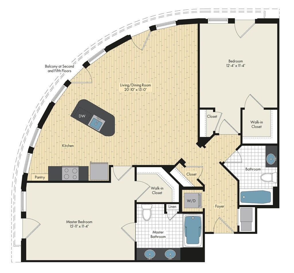 1 Bed, 2 Baths, 1105 sq ftAvailable NowLargest 1 BedroomThis is the largest 1 Bedroom at this PropertyModel Gallery