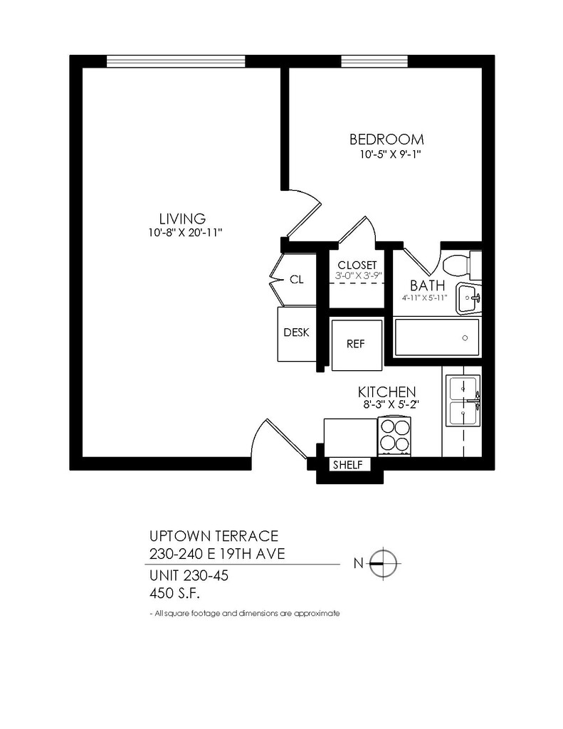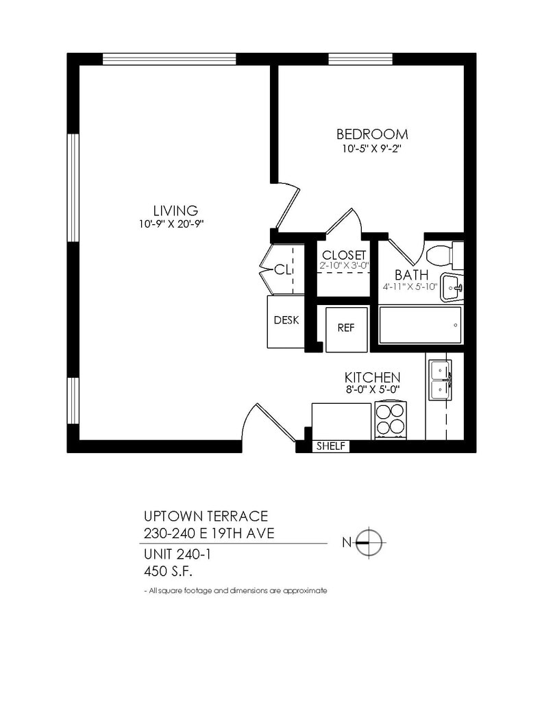 1 Bedroom - Floorplan 10 Apartment Unit: 230-45Apartment Model: 1 Bedroom$1,0451 Bedroom, 1 Bath, 450 sq ftAvailable Now![]()