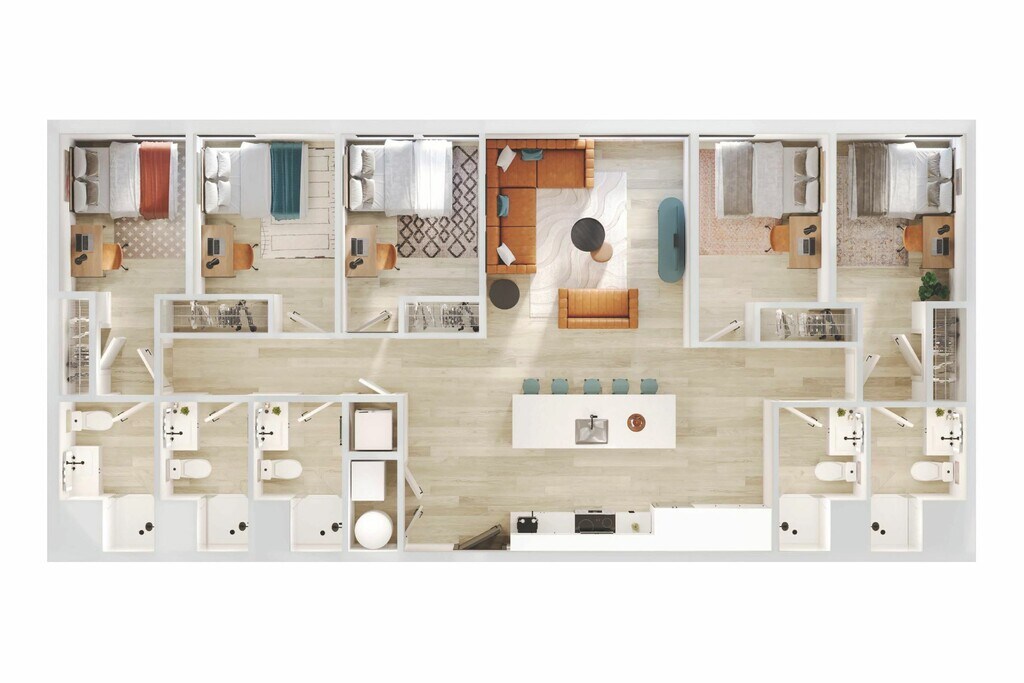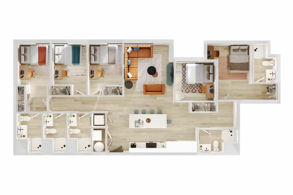 5BR - 03 - Floorplan 1 Apartment Unit: Attached BathroomApartment Model: 5BR - 035 Bedroom, 5 Bath, 1542 sq ftAvailable Now5BR - 02