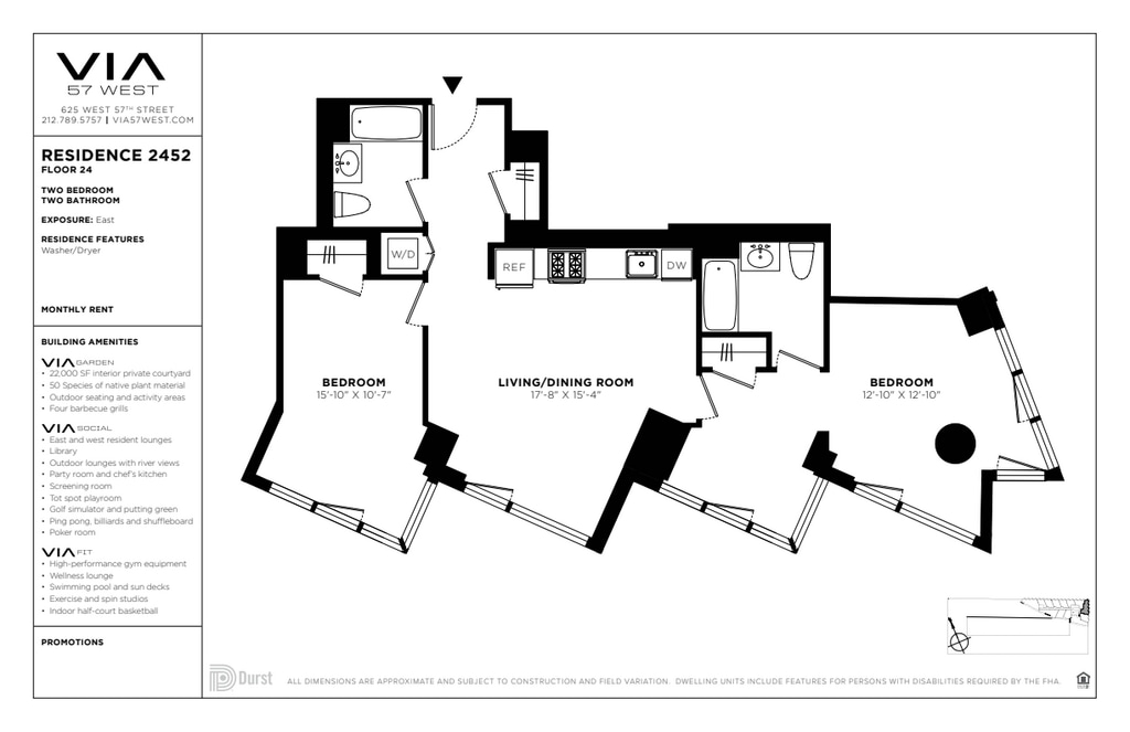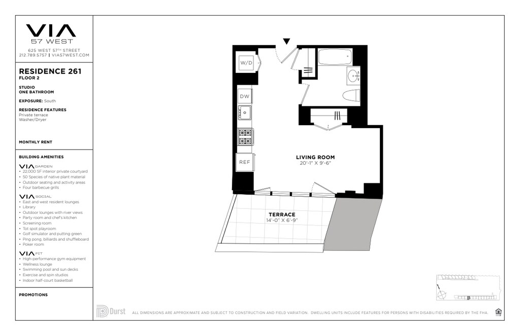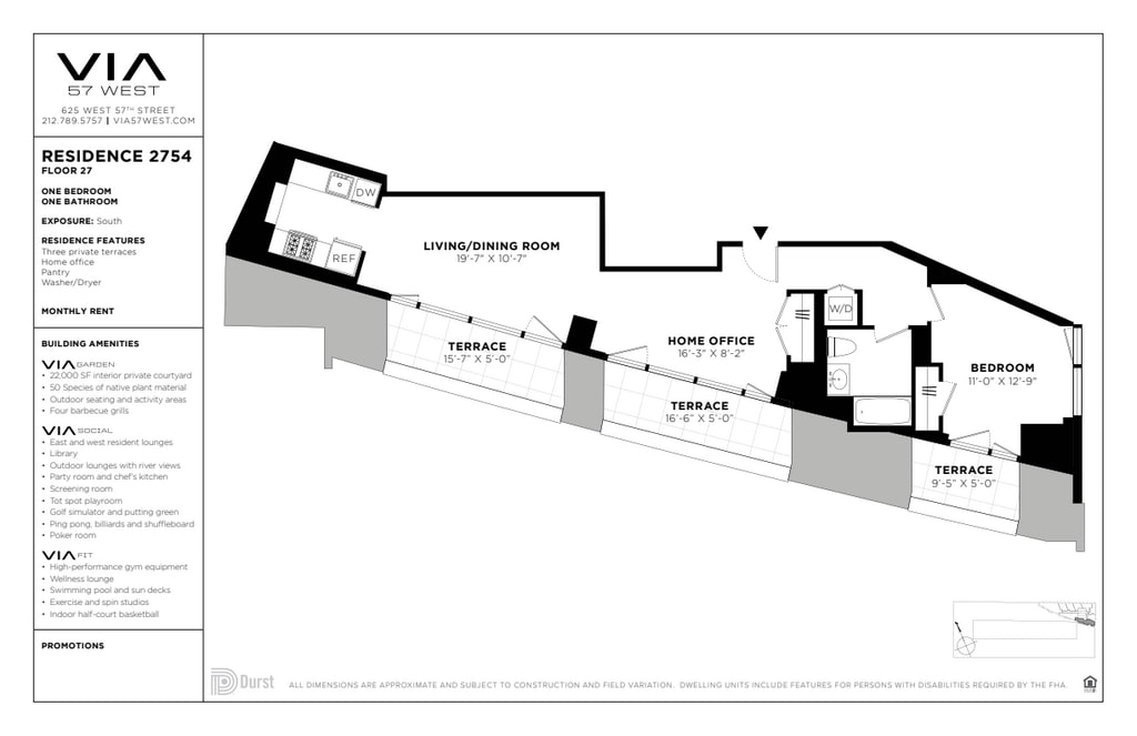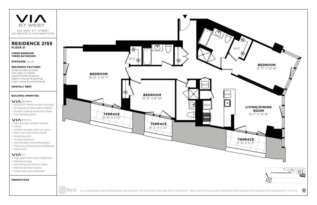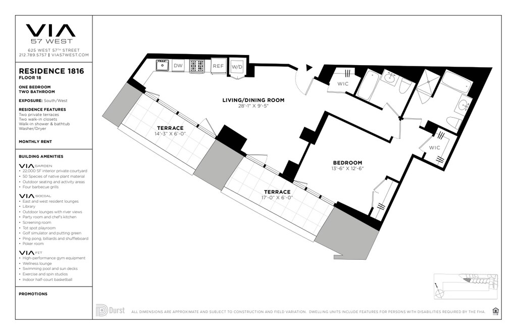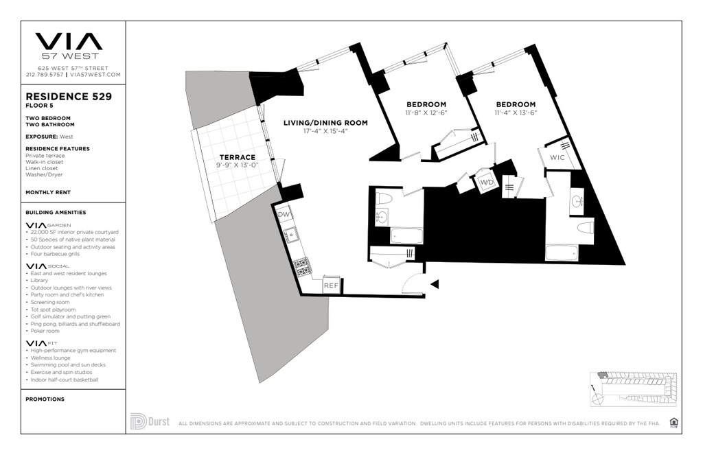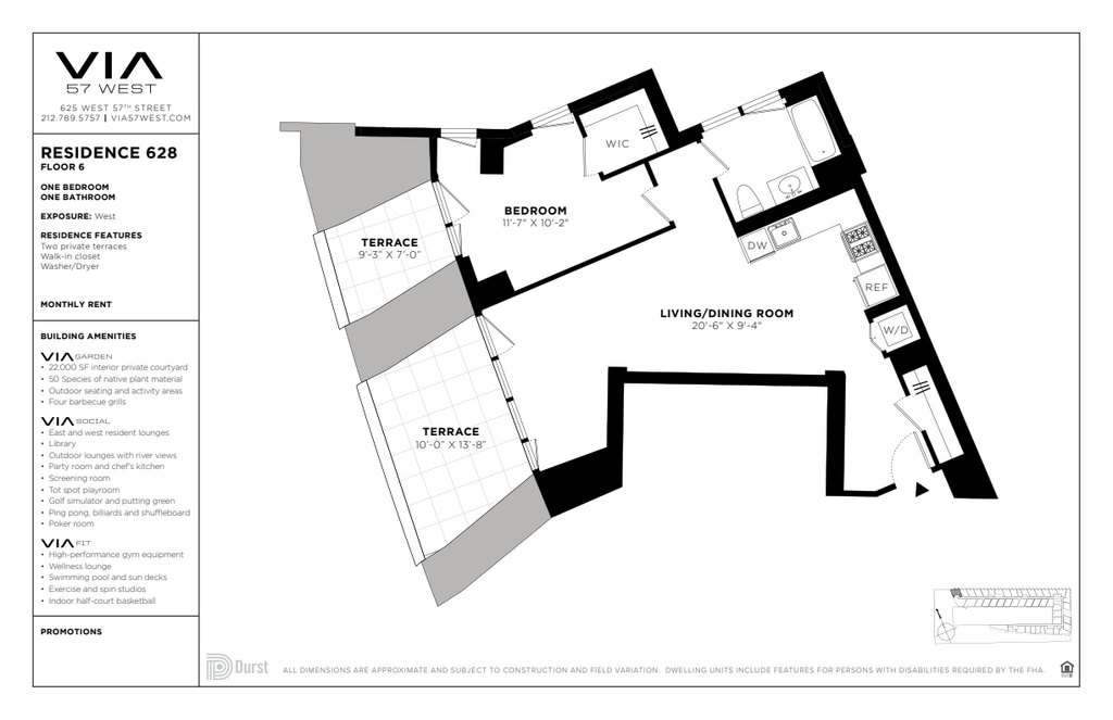 Designed by award-winning Bjarke Ingles Group, VIA 57 WEST offers a range of studio, one, two, three, and four-bedroom residences, many with private terraces. Spacious apartments, expansive amenities and a lush private resident courtyard balance the vibrant energy of Manhattan with the tranquility of nature, creating an iconic and visual gateway to New York. Unparalleled amenities, sophisticated fitness facilities, a 25-yard pool, and a central garden oasis enhance the living experience and wellbeing of VIA residents. Thoughtfully-curated resident programming and community events provide opportunities for residents to enjoy social interaction and an enhanced lifestyle. VIA 57 WEST’s human-centered approach blends environmental responsibility with resident wellness. All materials and construction techniques are carefully considered for resiliency, global impact and contribution to the health and productivity of our residents. FARE Act Disclosure. This listing is intended to be used by prospective renters and may not be republished without the prior written consent of The Durst Organization. Absent an express written agreement or acknowledgment to the contrary, The Durst Organization and its affiliates (1) do not utilize the services of third-party brokers or agents in connection with the rental of residential apartments and (2) will not assume responsibility for any brokerage fees incurred by a prospective renter. The Durst Organization and its affiliates will not charge or collect fees from a prospective renter except for such fees as permitted by law and disclosed to the prospective renter.