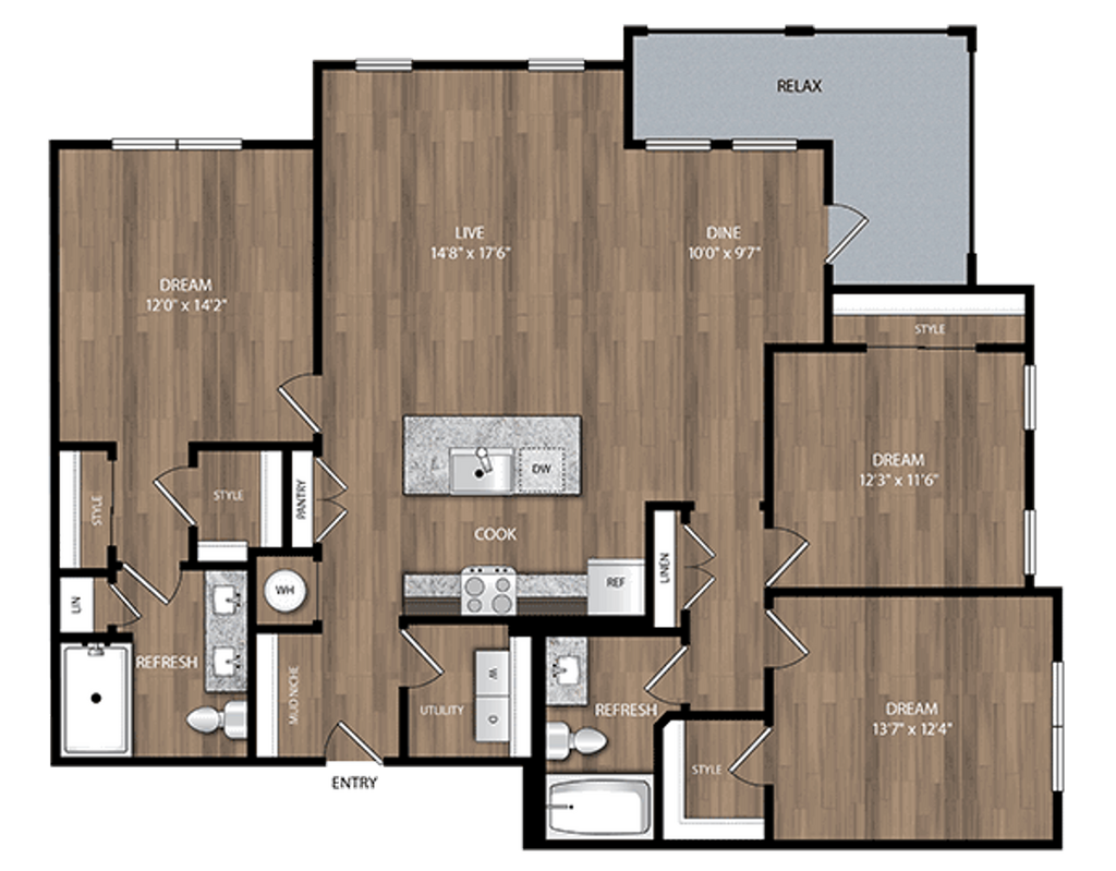 The S1-E3 units at Vive Apartments is a Studio 1 bedroom and 1 bathroom floor plan with 634 square feet of comfortable living space in Fort Myers, FL. This open floor plan features a spacious living room, a modern kitchen with sleek finishes, and a private bedroom retreat with barndoor closing — perfect for relaxing after work. Located in a vibrant apartment community with resort-style amenities and a convenient location near shopping, dining, and beaches, Vive Apartments makes it easy to enjoy the best of Fort Myers living. Now leasing for 12-month terms.