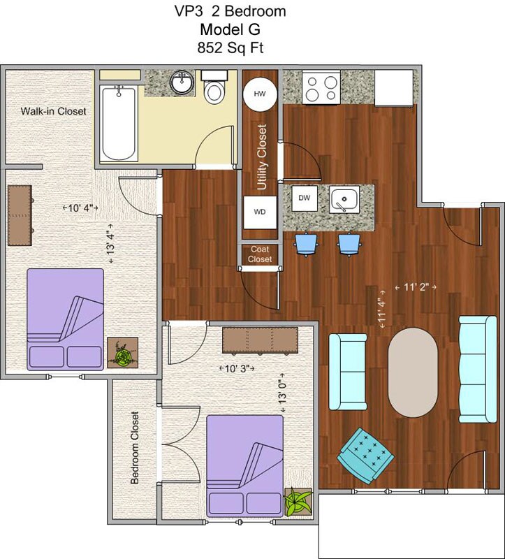 Apartment Model: 2 Bedroom - Model G | Available Now$1,7252 Bedroom, 1 Bath, 852 sq ftAvailable Now![]()
