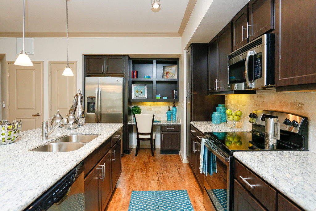 Every apartment home at Valencia Place offers contemporary luxuries like stunning crown molding to highlight the high, roomy ceilings. Your inner chef will love taking advantage of the gourmet kitchen, which comes outfitted with energy efficient, stainless steel appliances package, custom cabinetry and elegant granite slab countertops with under-mount sinks. The stunning simulated-wood flooring is both beautifully inviting and easy to care for. You’ll also love the ample amount of natural light shining through the expansive windows. Select home designs feature an in-home, full-sized washer and dryer, built-in home office station and an attached garage.