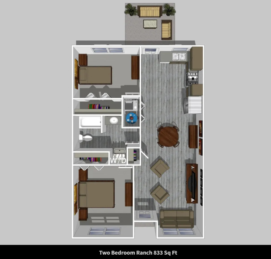 Price Availability Date Unit Sq Ft $1,175 Call for Availability Ranch 2 Bedroom 833 sq ft Model Amenities and Features