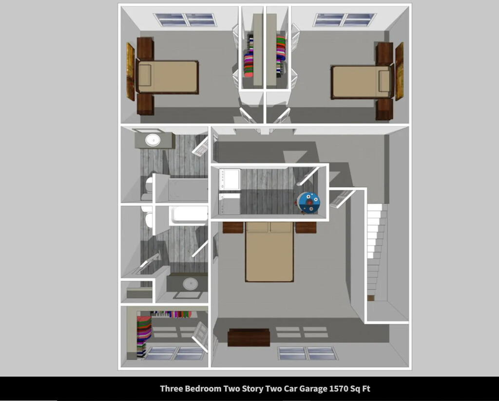 Apartment Model: 2 Story 3 Bedroom Townhome$1,6503 Bedroom, 2 Bath, 1570 sq ftUnavailable![]()