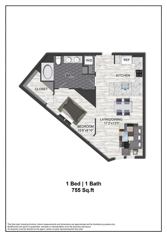 Apartment Model: A6From $1,9691 Bedroom, 1 Bath, 755 sq ftAvailable NowFloor plans are artist's rendering. All dimensions are approximate. Actual product and specifications may vary in dimension or detail. Not all features are available in every rental home. Prices and availability are subject to change. Base rent is based on monthly frequency. Additional fees may apply, such as but not limited to package delivery, trash, water, amenities, etc. Deposits vary. Please see a representative for details.