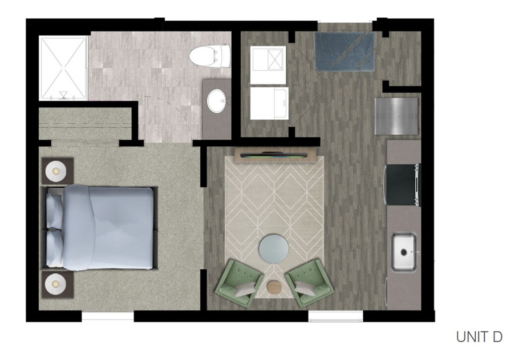 Apartment Model: Studio - F.2 (with Wall)$1,060Studio, 1 Bath, 427 sq ftAvailable NowFloorplansPhotos![]()