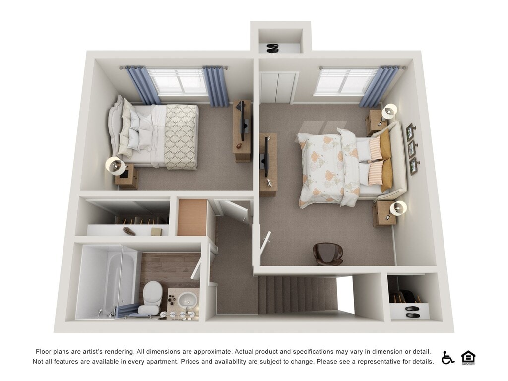 Two Bedroom Townhome - Floorplan 2 Floor plans are artist's rendering. All dimensions are approximate. Actual product and specifications may vary in dimension or detail. Not all features are available in every rental home. Prices and availability are subject to change. Base rent is based on monthly frequency. Additional fees may apply, such as but not limited to package delivery, trash, water, amenities, etc. Deposits vary. Please see a representative for details.