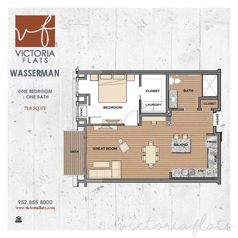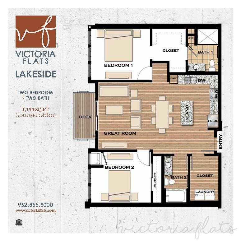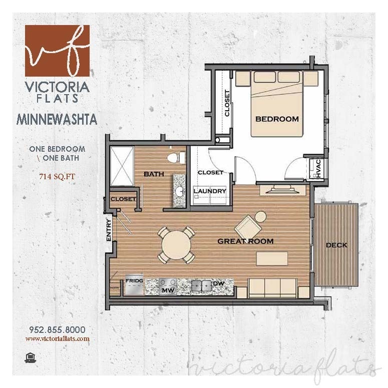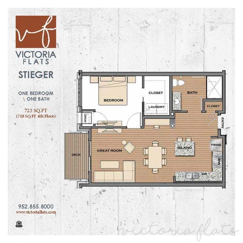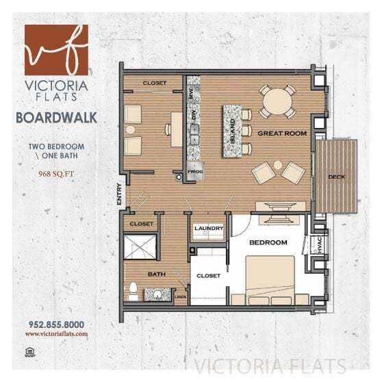 Welcome to Victoria Flats! With over 15 layouts brimming with high-end features, as well as places to socialize, and a rooftop deck to admire nature views, our community sets the bar for luxury living. But thats not everything that makes our apartments in Victoria, MN, such an amazing place to dwell in its also the downtown location that will steal your heart. Call us today and ask anything you want to know about our Downtown Victoria apartments!Non-Optional FeesApplication fee: $50/adultNon-refundable administrative fee: Management charges a $150, non-refundable, administrative fee that is related to our internal and administrative costs for the establishment of a resident file, and preparation of initial lease paperwork and related addendums. This administrative fee must be paid, in addition to the payment of month's rent, any prorated rent, or any additional deposit that might be required on the day of move-in.Utility administrative fee: $8/month