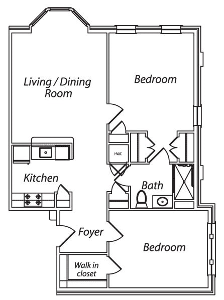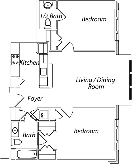 2 Bedroom, 1 Bath - Floorplan 1 2 Bedroom, 1.5 Bath