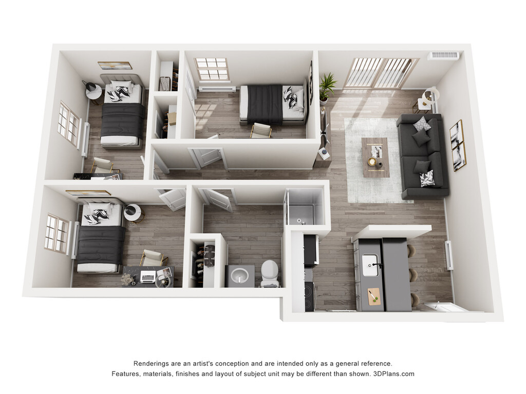 3BR/1BA - Floorplan 1 Apartment Unit: PrivateApartment Model: 3BR/1BA$1,0753 Bedroom, 1 Bath, sq ftAvailable NowApartment Unit: PrivateApartment Model: 3BR/1BA$1,1253 Bedroom, 1 Bath, sq ftAvailable August 20, 20264 Bedrooms