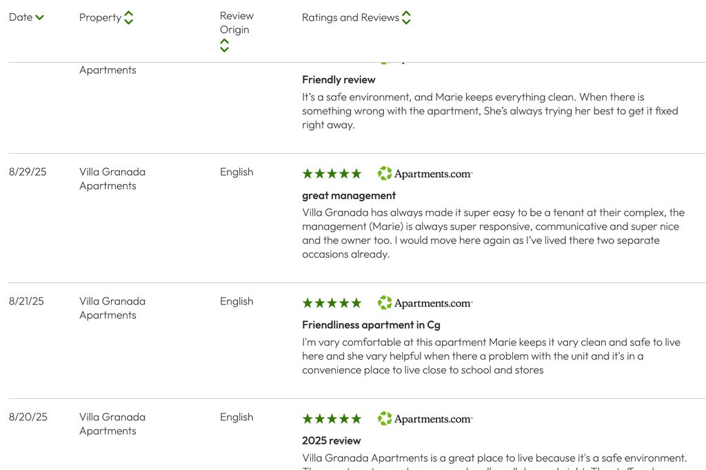 August 28, 2025Villa Granada has always made it super easy to be a tenant at their complex, the management (Marie) is always super responsive, communicative and super nice and the owner too. I would move here again as I’ve lived there two separate occasions already.Review from Apartments.com