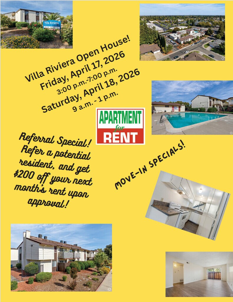 The current rent special at Villa Riviera Apartments is: Open House + Move in Special!!~~Check out our wonderful community on 4/17/26 from 3pm-7pm and 4/18/26 from 9am-1pm! Refer a potential resident and get $200 OFF next month rent!! Have a credit score of 650+ and receive first month FREE!!.