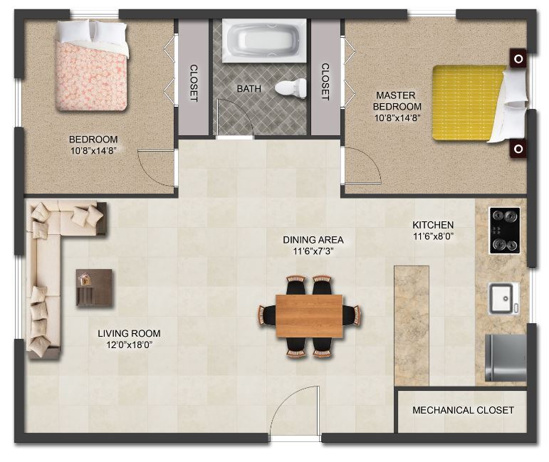 2 Beds, 1 Bath, 850 sq ftAvailable NowModel Gallery