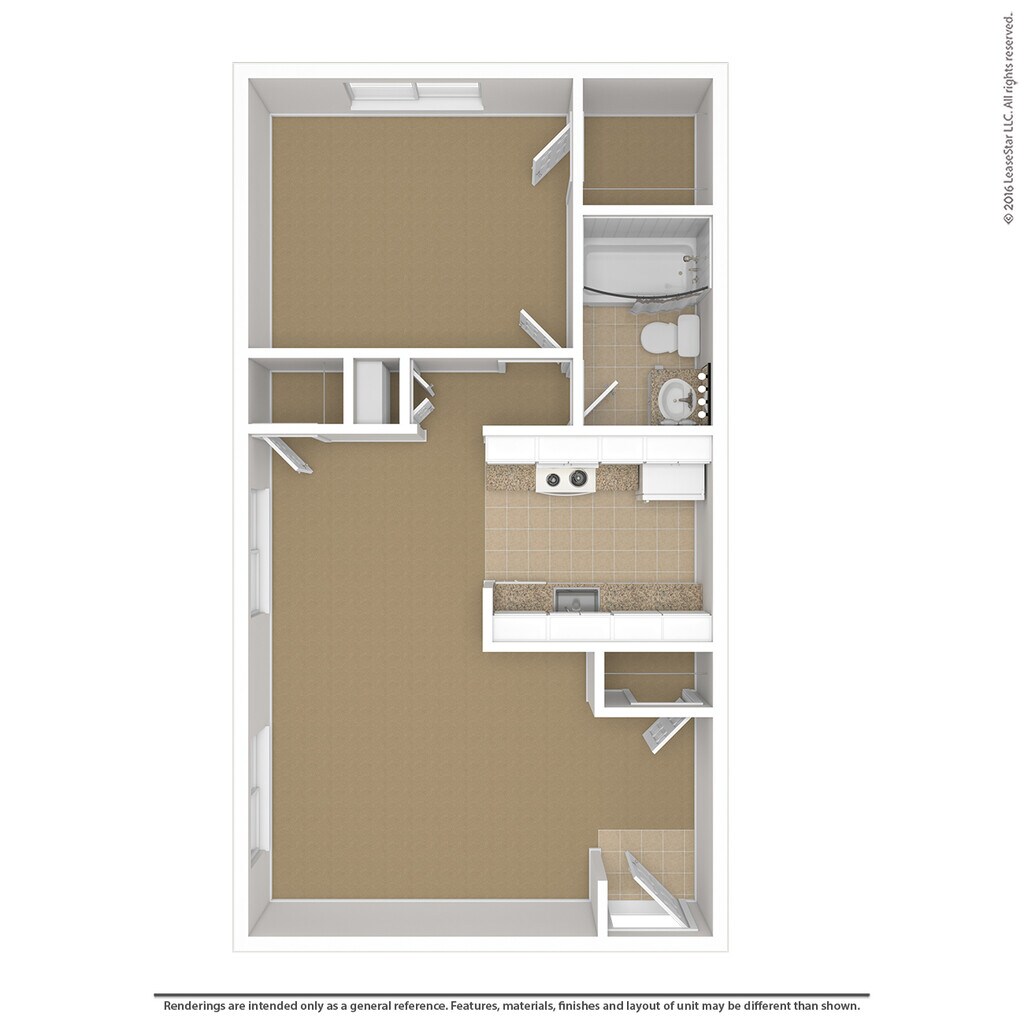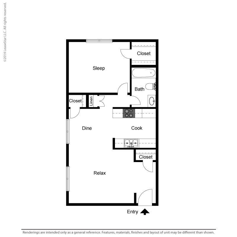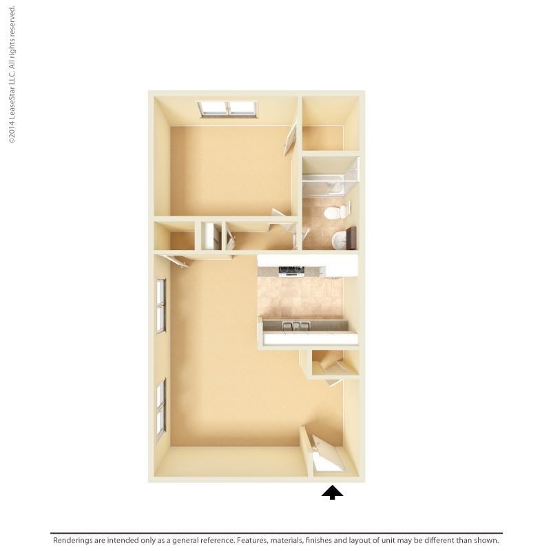 One Bedroom - Floorplan 1 Floor plans are artist's rendering. All dimensions are approximate. Actual product and specifications may vary in dimension or detail. Not all features are available in every rental home. Prices and availability are subject to change. Base rent is based on monthly frequency. Additional fees may apply, such as but not limited to package delivery, trash, water, amenities, etc. Deposits vary. Please see a representative for details.