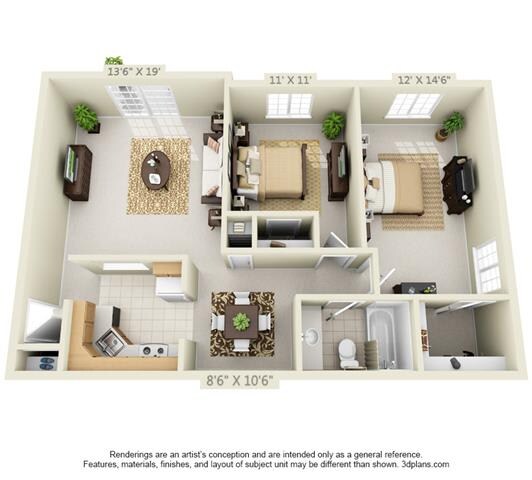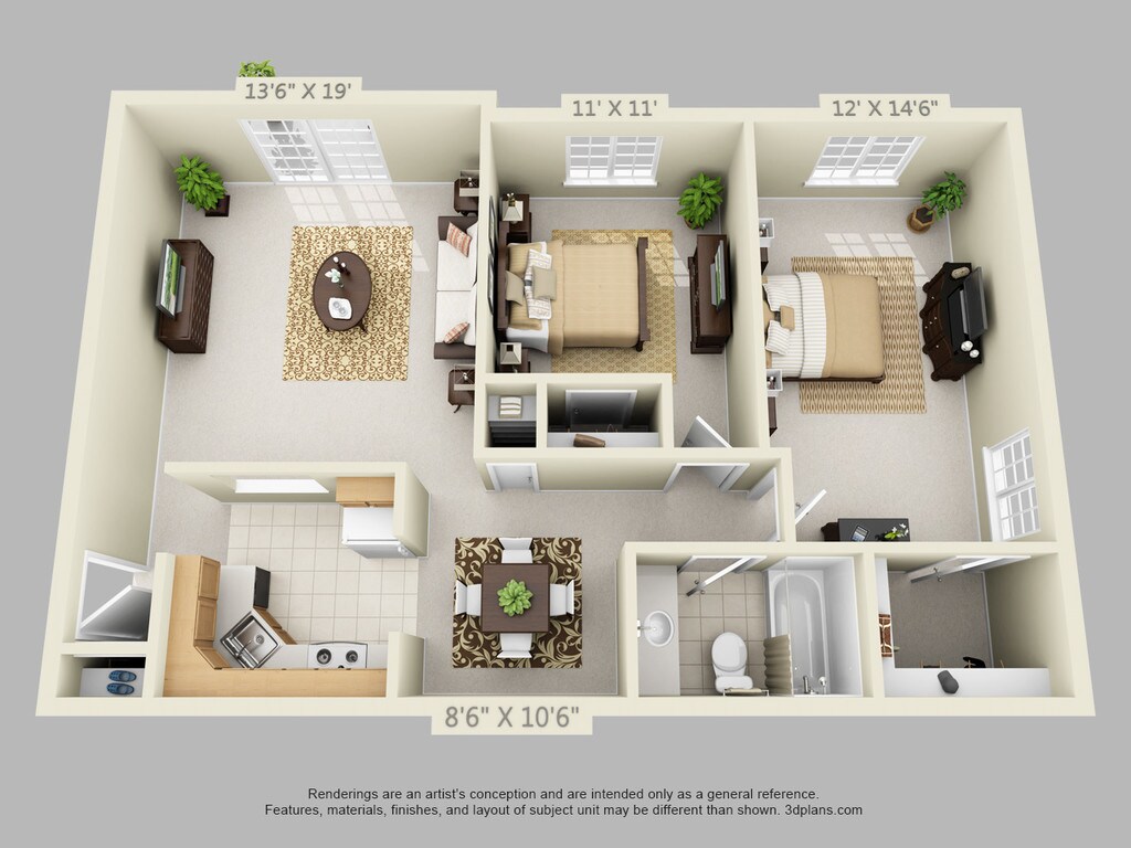 Apartment Model: 2 Bedroom LowerFrom $1,3752 Bedroom, 1 Bath, 930 sq ftAvailable Now![]()