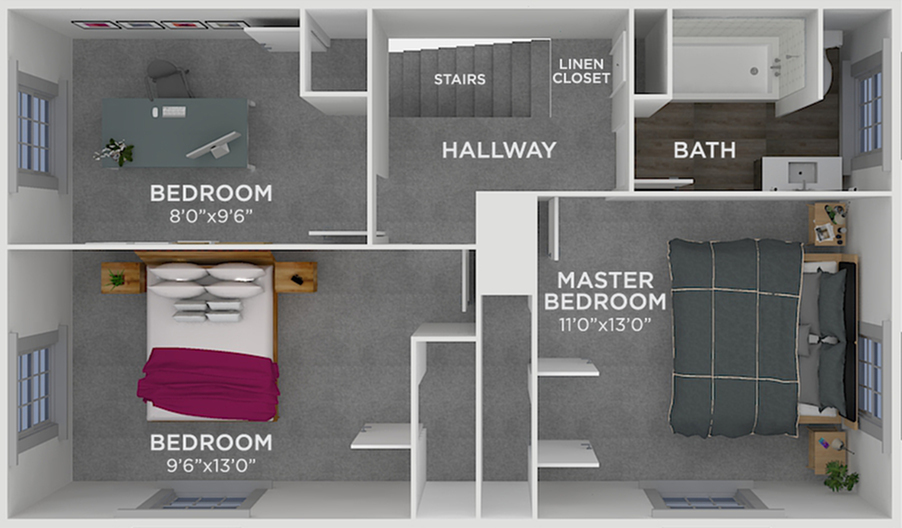 Apartment Model: 3BR/1.5BA Townhome GrayFrom $1,9703 Bedroom, 1.5 Bath, 1100 sq ftAvailable Now![]()