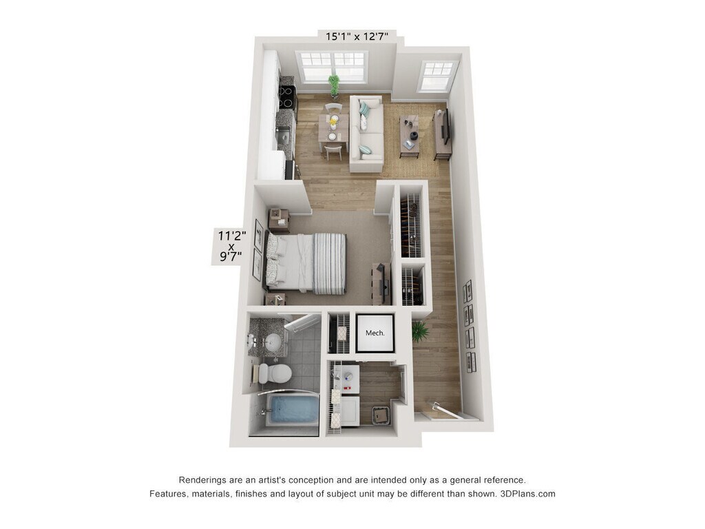 Apartment Model: The Chestnut$1,485Studio, 1 Bath, 553 sq ftUnavailableFloor plans are artist's rendering. All dimensions are approximate. Actual product and specifications may vary in dimension or detail. Not all features are available in every rental home. Please see a representative for details.