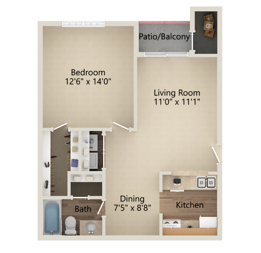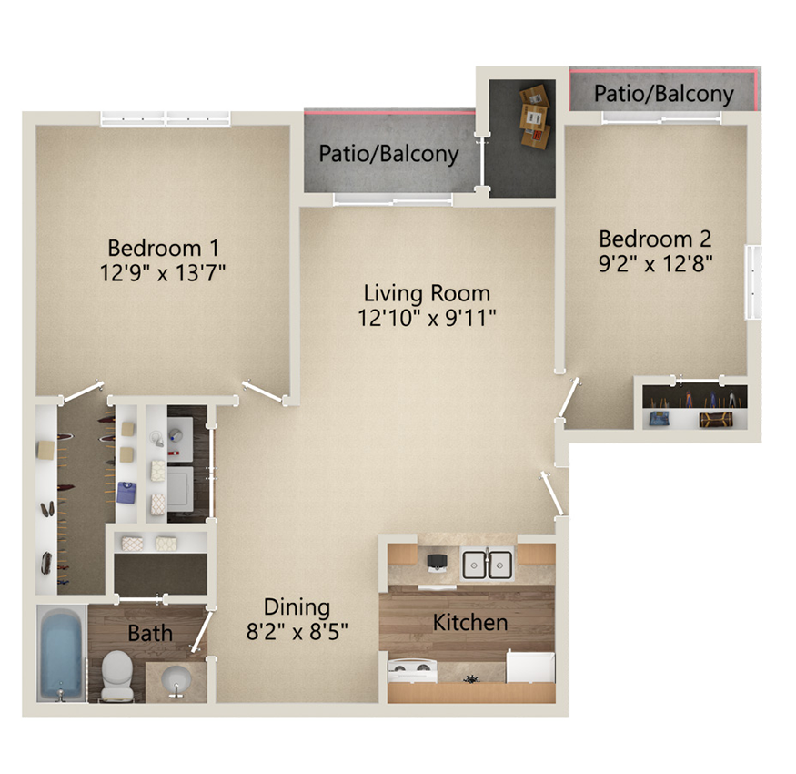Apartment Model: 2 Bed/1 BathFrom $9752 Bedroom, 1 Bath, 817 sq ftAvailable Now![]()