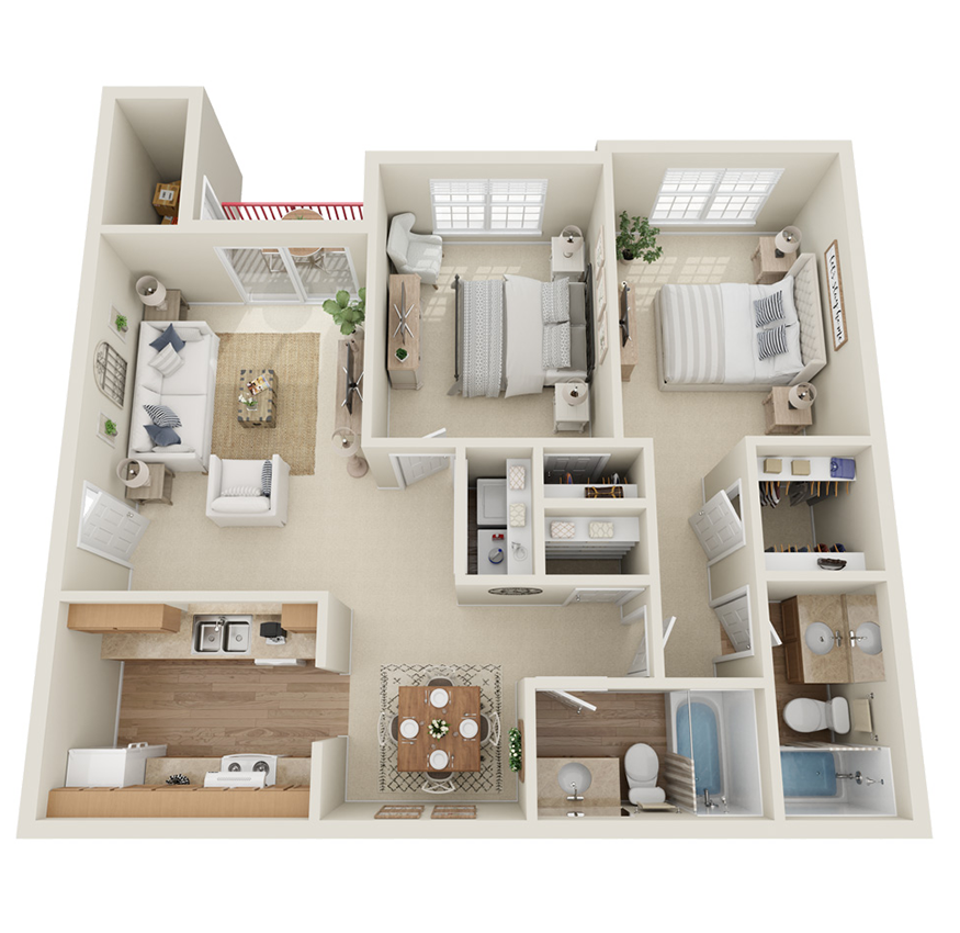 Apartment Model: 2 Bed/2 Bath$1,2302 Bedroom, 2 Bath, 971 sq ftAvailable November 21, 2025![]()