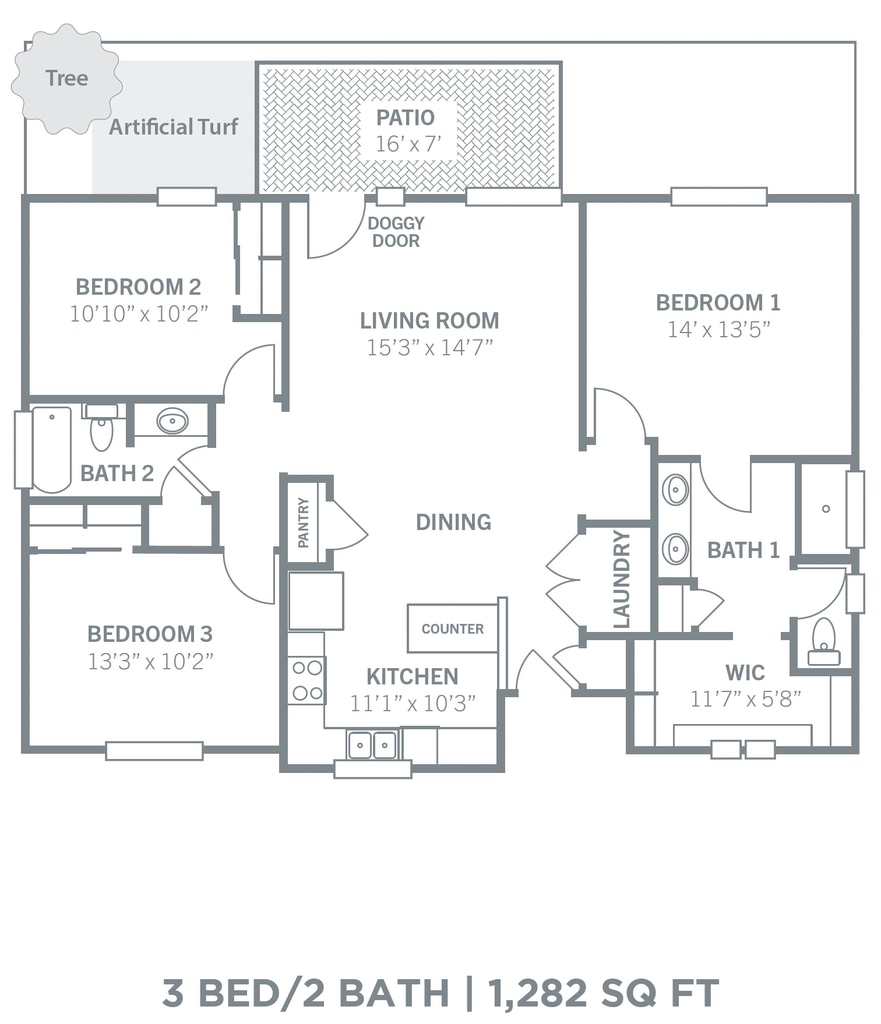 Apartment Model: 3 Bed 2 BathFrom $2,6993 Bedroom, 2 Bath, 1282 sq ftAvailable NowFloorplansPhotos![]()