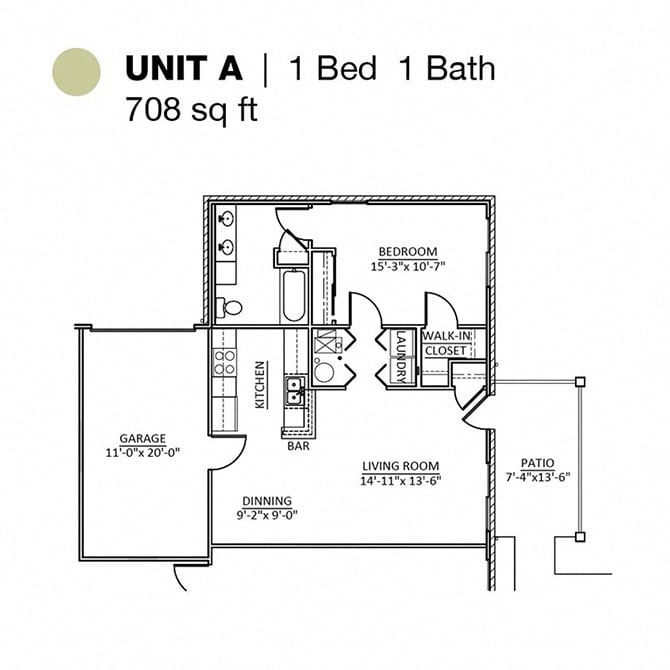 Apartment Model: 1 Bed 1 Bath$1,4251 Bedroom, 1 Bath, 708 sq ftAvailable Now1 Bed 1 Bath - Floorplan 1 2 Bedrooms