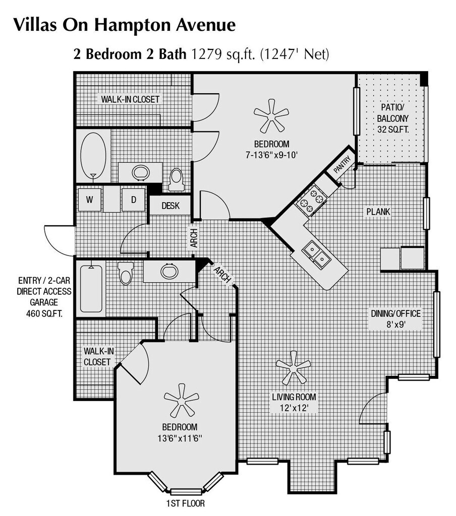 Villas On Hampton Avenue offers 1 to 3 Bedroom apartments starting from $1,496 and having 812–1,498 sq ft. Here is the current pricing and availability:
