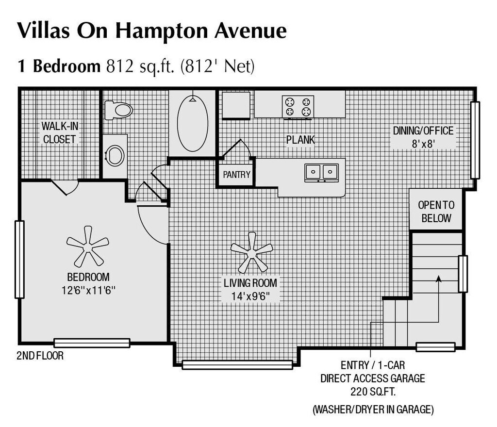 1 Bed 1 Bath 1-Car Garage 812 SqFt - Floorplan 2 ![]()