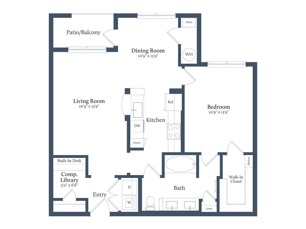 Apartment Model: 1x1E$2,7021 Bedroom, 1 Bath, 916 sq ftAvailable July 13, 2026Floor plans are artist's rendering. All dimensions are approximate. Actual product and specifications may vary in dimension or detail. Not all features are available in every rental home. Please see a representative for details.