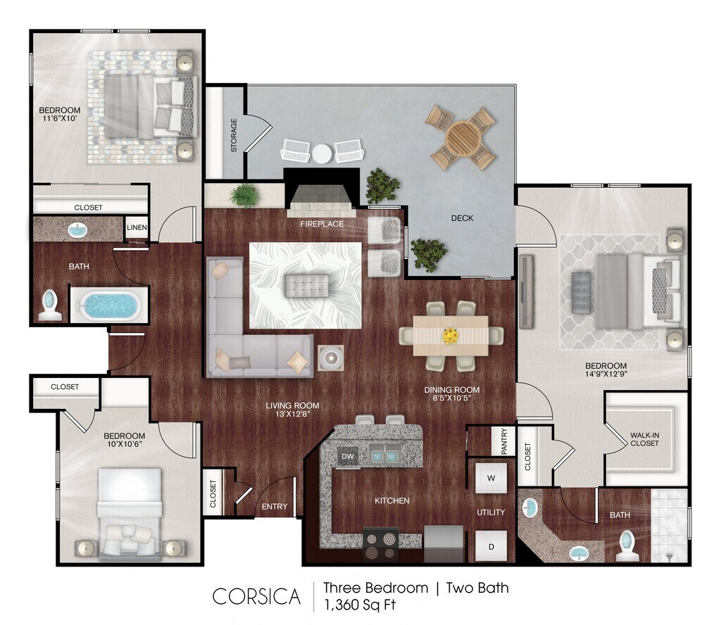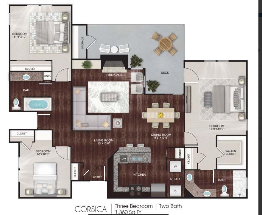 - 3 BedroomsShow Unavailable Floorplans- Corsica - 3 Bed / 2 Bath- $1,7323 Beds, 2 Baths, 1360 sq ftAvailable Nov 7- Model Gallery- Floorplans- Availability Details- Price - Availability Date - Unit - Sq Ft - Deposit - $1,732 - November 7, 2025 - 0515 - 1360 - $200 - Unit 0515 Amenities and Features- Features- High Speed Internet Access