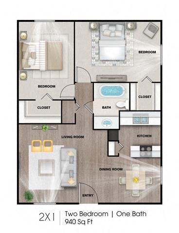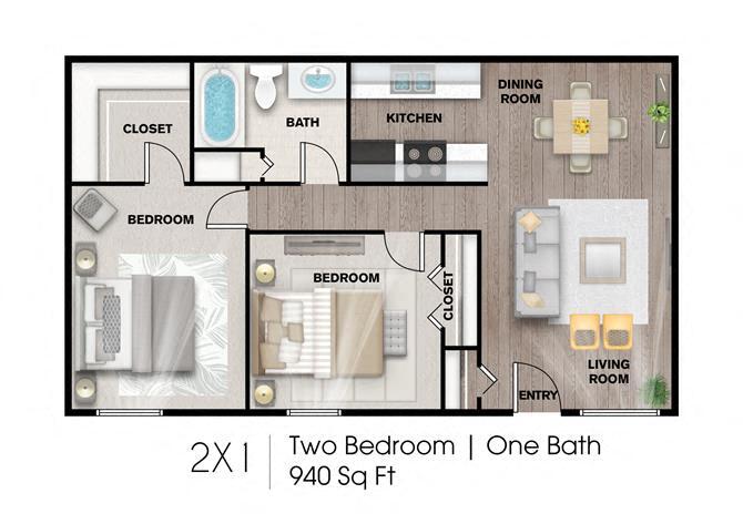 2 Beds, 1 Bath, 940 sq ftModel Gallery
