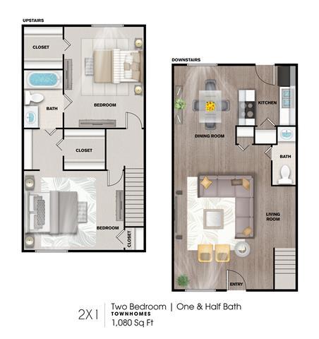 2 Beds, 1.5 Baths, 1080 sq ftAvailable NowLargest 2 BedroomThis is the largest 2 Bedroom at this PropertyModel Gallery