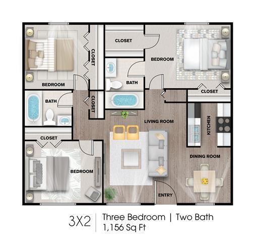 3 Beds, 2 Baths, 1156 sq ftModel Gallery