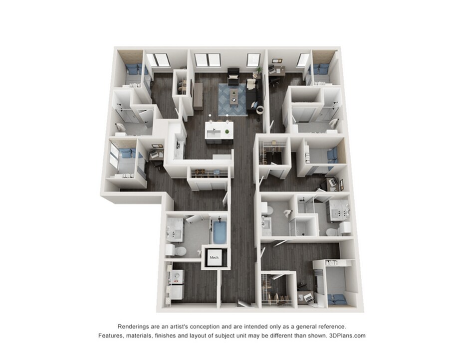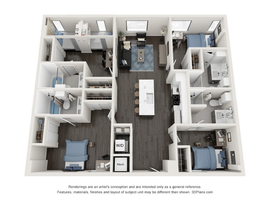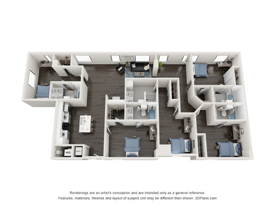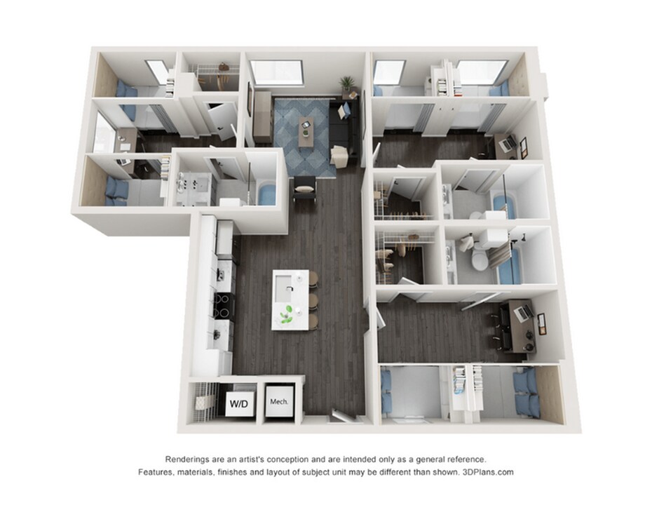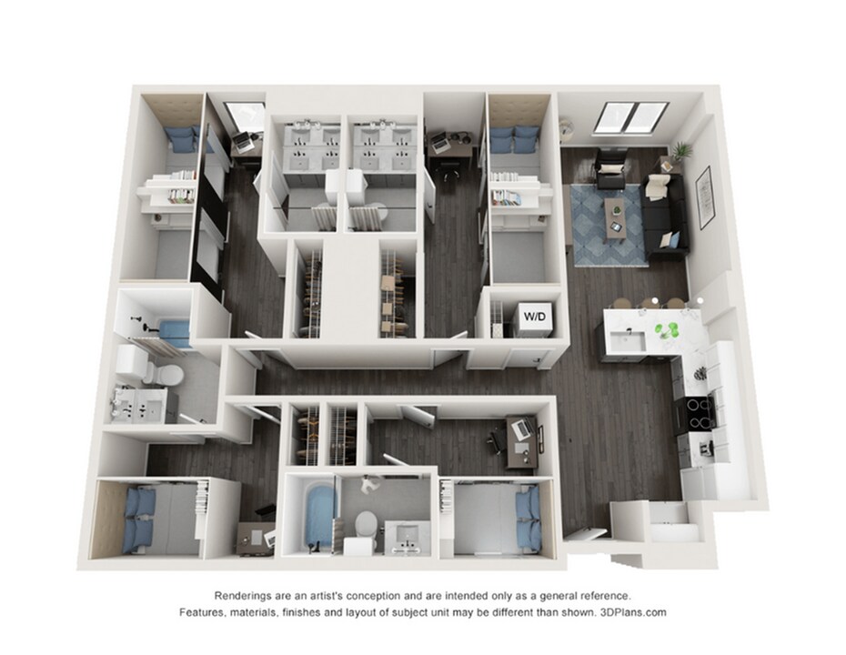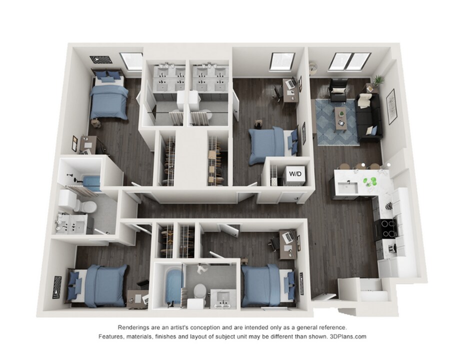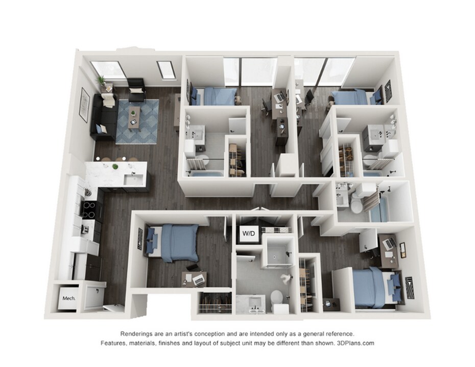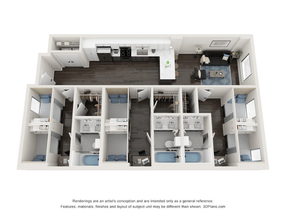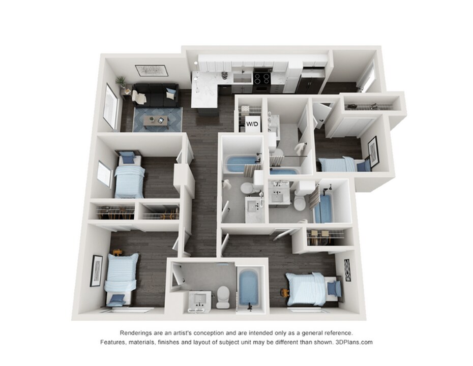 - 4 Bedrooms- D5TH-SHARED- From $1,0994 Beds, 4 Baths, 2200 sq ftAvailable NowLargest 4 BedroomThis is the largest 4 Bedroom at this Property- Model Gallery- Floorplans- Availability Details- Price - Availability Date - Unit - Sq Ft - View Details - $1,789 - Available Now - Shared - 2200 - $1,099 - August 21, 2026 - Shared - 2200 - Model Amenities and Features- Unique Features- 65” TVs in Each Living Room