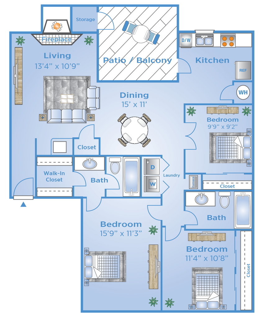 Apartment Model: B3From $1,7152 Bedroom, 2 Bath, 1072 sq ftAvailable NowFloorplansPhotos![]()