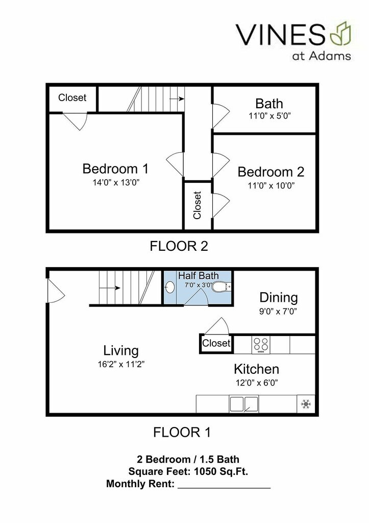 Apartment Model: 2 Bed 1.5 Bath Townhouse2 Bedroom, 1.5 Bath, 1050 sq ftAvailable NowFloorplansPhotos![]()