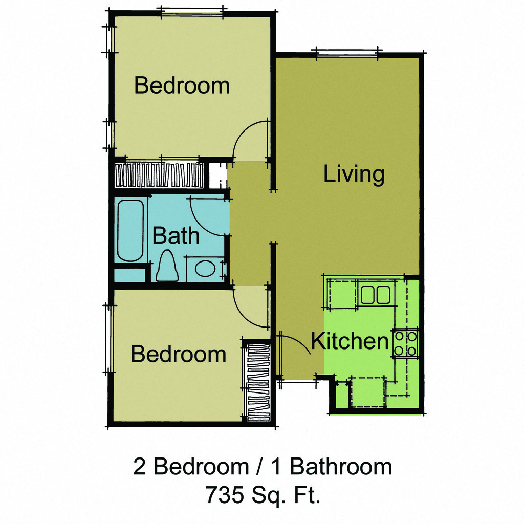 2 Beds, 1 Bath, 735 sq ftPlus FeesAvailable NowModel Gallery
