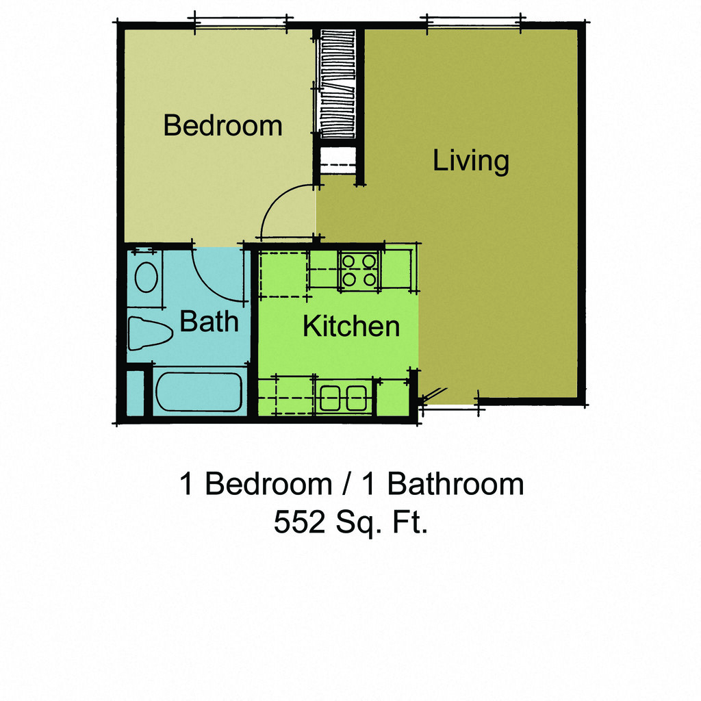 Apartment Model: 1 Bedroom$1,1991 Bedroom, 1 Bath, 552 sq ftAvailable NowFloorplansPhotos![]()