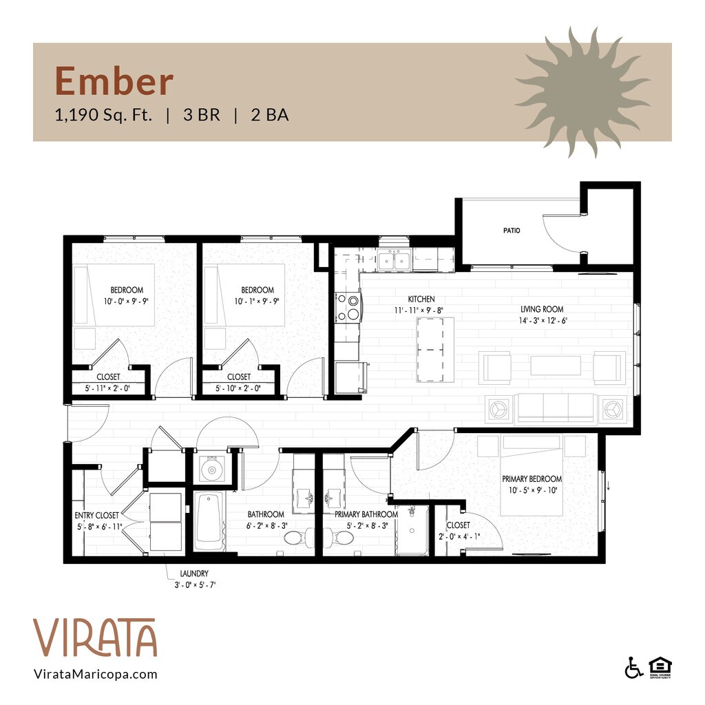 Apartment Model: Ember ADA$1,7503 Bedroom, 2 Bath, 1190 sq ftAvailable June 16, 2026Floor plans are artist's rendering. All dimensions are approximate. Actual product and specifications may vary in dimension or detail. Not all features are available in every rental home. Please see a representative for details.