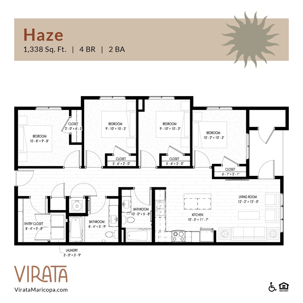 Apartment Model: Haze ADA$1,9534 Bedroom, 2 Bath, 1338 sq ftAvailable June 16, 2026Floor plans are artist's rendering. All dimensions are approximate. Actual product and specifications may vary in dimension or detail. Not all features are available in every rental home. Please see a representative for details.
