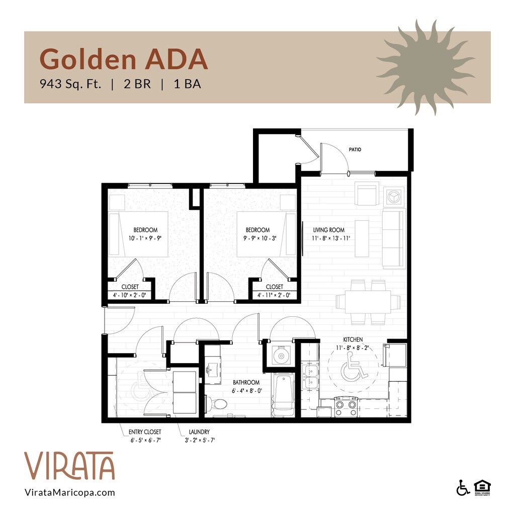 Apartment Model: Golden ADAFrom $1,5152 Bedroom, 1 Bath, 943 sq ftAvailable June 16, 2026Floor plans are artist's rendering. All dimensions are approximate. Actual product and specifications may vary in dimension or detail. Not all features are available in every rental home. Please see a representative for details.