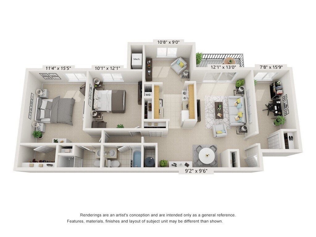2Bed 2Bath Den - Floorplan 1 Apartment Unit: 620-203Apartment Model: 2Bed 2Bath Den2 Bedroom, 2 Bath, 1214 sq ftAvailable Now3 Bedrooms