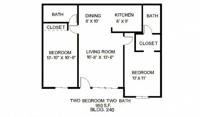 Apartment Model: 2B 2BCall For Rates2 Bedroom, 2 Bath, 950 sq ftUnavailable2B 2B - Floorplan 1