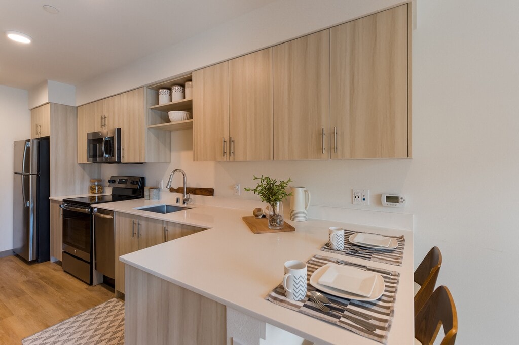 In the heart of Kirkland's Park Lane pedestrian oasis. Two blocks from sparkling Lake Washington. Vibrantly designed living spaces with air conditioning, modern tonal finishes, quartz counters and view decks. Resident 24-hour fitness center, community terraces with BBQs and active neighborhood scene. Viva la Voda!